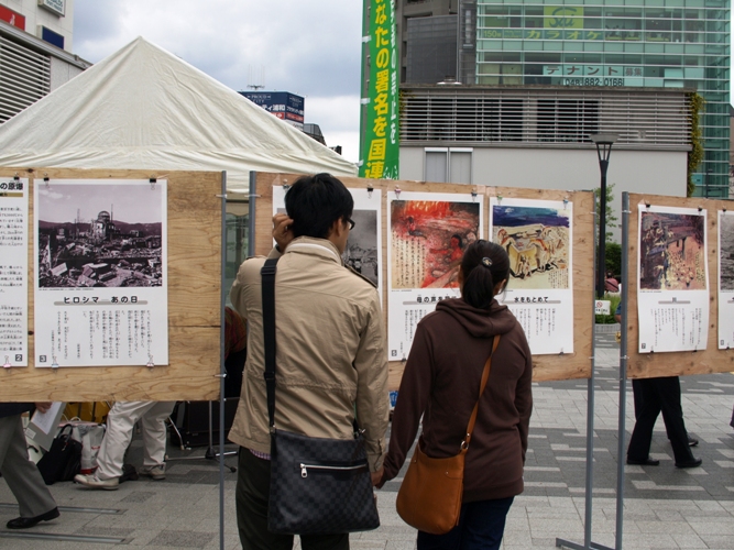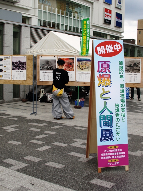 4月30日、浦和駅東口パルコ前「市民広場」で開催された、「原爆と人間」パネル展を見にしきました。GW前半、晴天に恵まれたこの日は、パルコ等に訪れる買い物客も多く、若いカップルや青年、また小さい子どもと手を繋ぎながらパネルを見る方の姿が多く見られました。