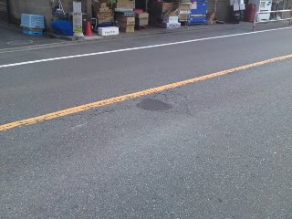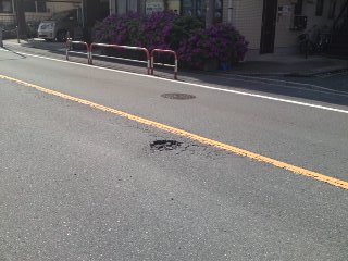 南町の戸田中通りに穴が空いていました。7日の朝、担当課に連絡し応急処理をお願いしたところ、直ぐに穴を埋めてくれまし